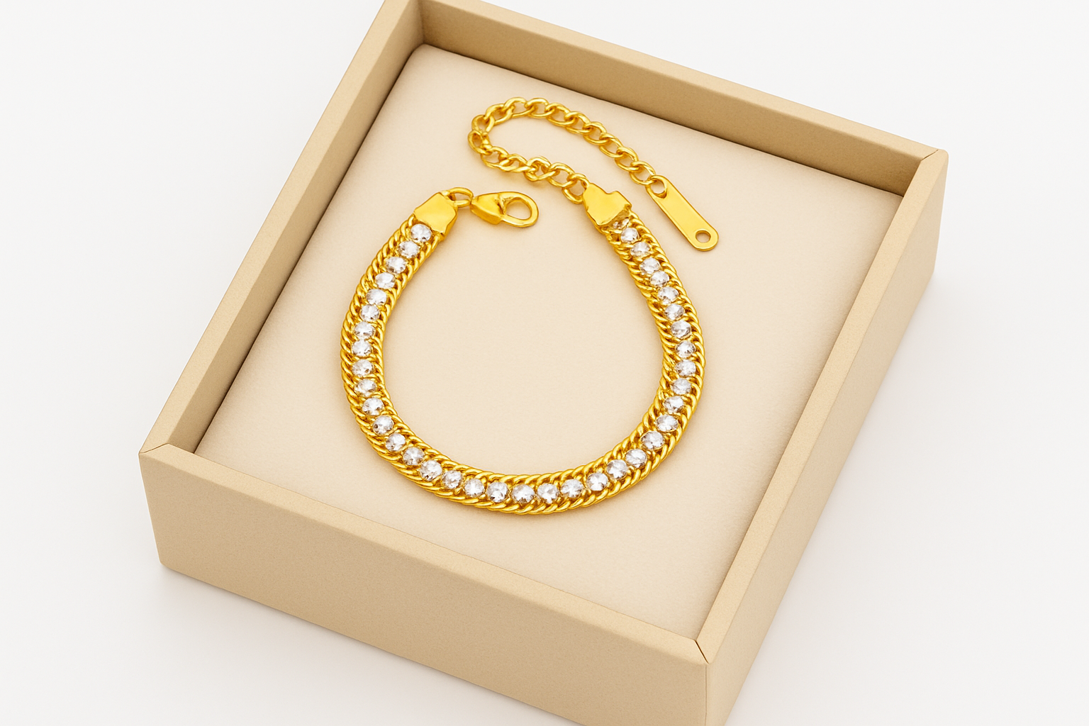 Add effortless elegance to your look with these delicate gold bracelets, each designed with fine chains, sparkling crystals, and charming details. Whether it’s the heart-charm style, the classic crystal line, or the minimalist double-layer design, these pieces offer a perfect blend of shine and sophistication—ideal for everyday wear, stacking, or gifting.